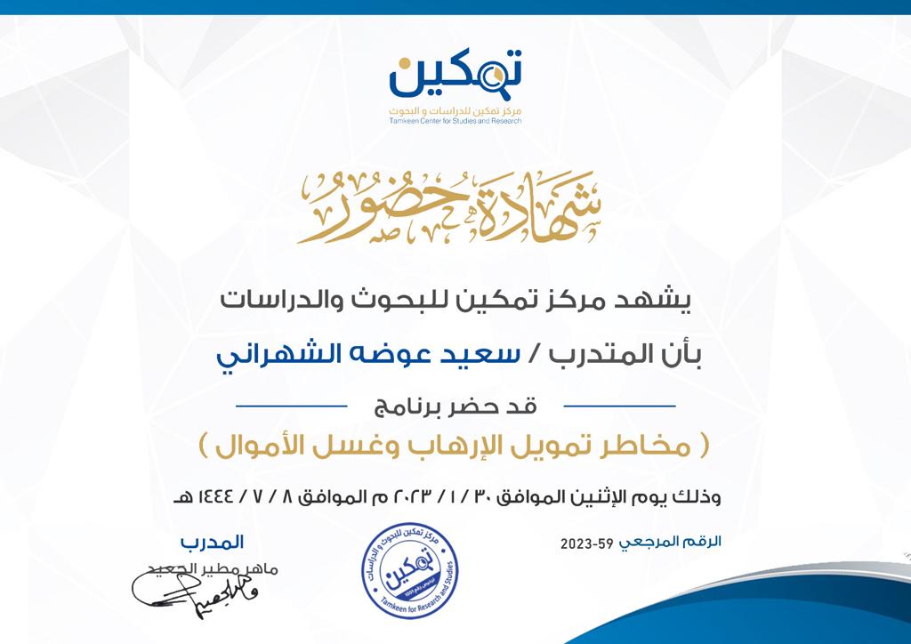 شهادات تدريب مجلس الادارة و العاملين في برنامج مخاطر تمويل الإرهاب